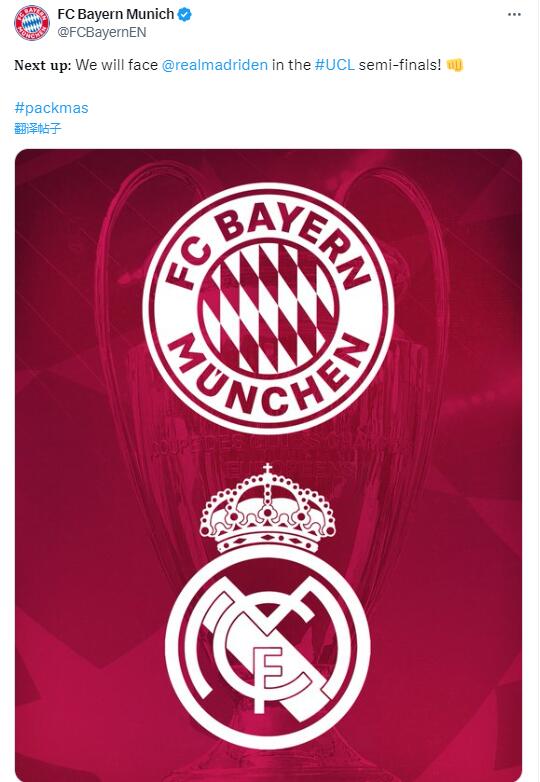 拜仁社媒发文:“我们将在欧冠半决赛对阵皇马