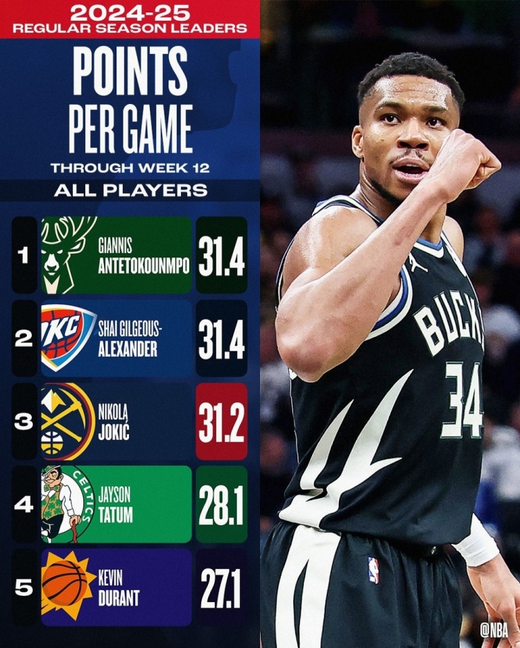 赛季至今数据榜:字母得分王吹羊助攻王小萨篮板王文班盖帽王