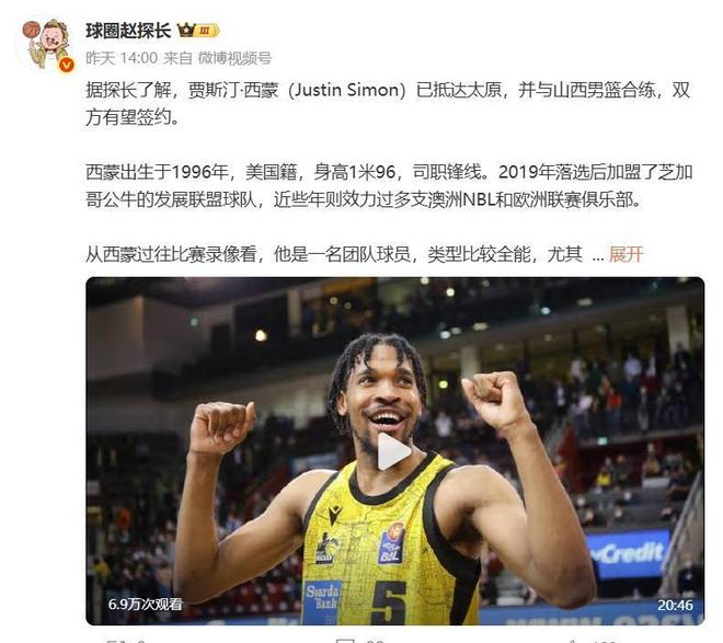 根据知名篮球媒体人“球圈赵探长”的消息,山西队的新外援贾斯汀-西蒙(Justin Simon)已经到达太原,目前正在进行试训,根据目前的情况来看这名防守悍将有望和山西队签约。西蒙今年29岁,身高1米96,臂展2米08,是NBA2019年的落选秀,曾短暂的加入过NBA公牛队下属的发展联盟球队,近年来主要活跃在欧洲联赛和澳大利亚NBL联赛。