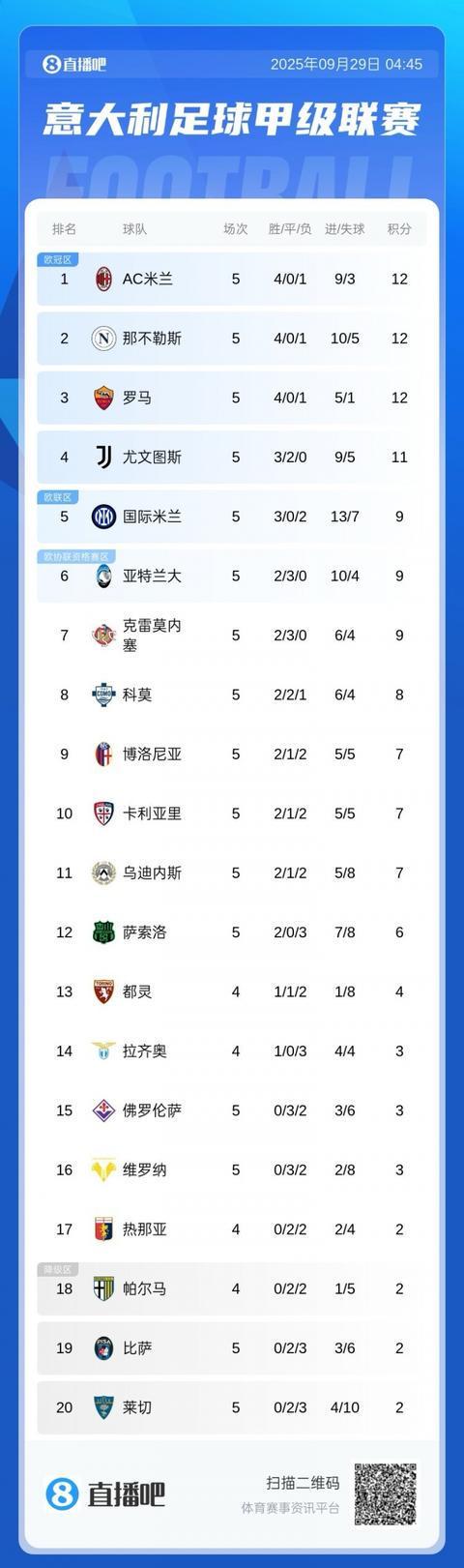 此役后米兰四连胜登顶,同样12分的还有那不勒斯和罗马。