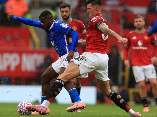 比赛刚刚开始8分钟,曼联就进球了!姆伯莫在右侧起球传中,禁区中路的芒特用左脚卸球,右脚直接凌空低射,皮球钻入球门右下角!芒特一停一射处理得太潇洒写意了!曼联取得梦幻般的开局。第21分钟,迪亚洛右侧带球内切兜射远角,被扑了出去。随后,姆伯莫的远射也是被门将化解了。4分钟后,布鲁诺-费尔南德斯远射中框,迪亚洛头球补射,顶偏了。
