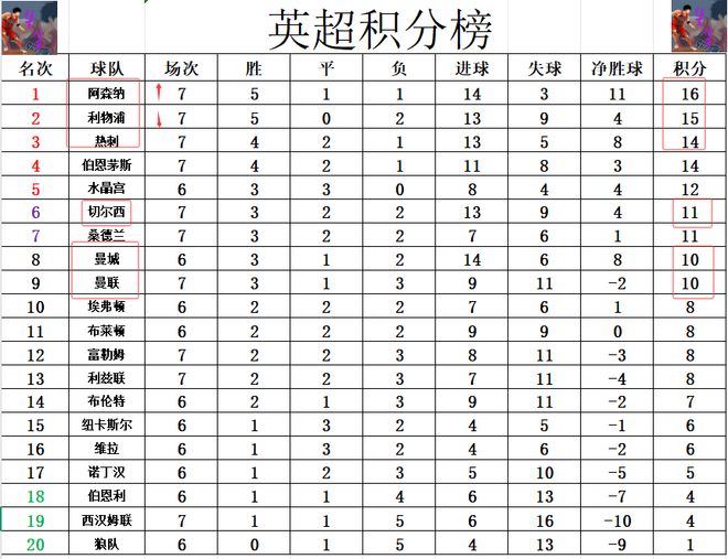 积分榜方面,利物浦英超2连败,英超欧冠双线3连败,上周末输球他们的榜首没有丢掉,但是今天输球后,他们就被阿森纳1分优势超过跌到第2,阿森纳登顶成功。热刺赢球凭借着净胜球优势力压伯恩茅斯升到第3,击败利物浦的切尔西则是暂时升到第6。曼联赢球止住颓势后,追上曼城,净胜球劣势排在曼城之后位列第9。