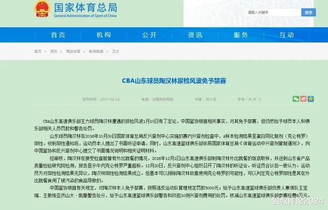 CBA山东高速俱乐部主力球员遭遇的尿检风波1月10日有了定论,中国篮协根据相关事实,对其免予禁赛,但仍然给予球员本人和俱乐部相关人员罚款和警告处罚。