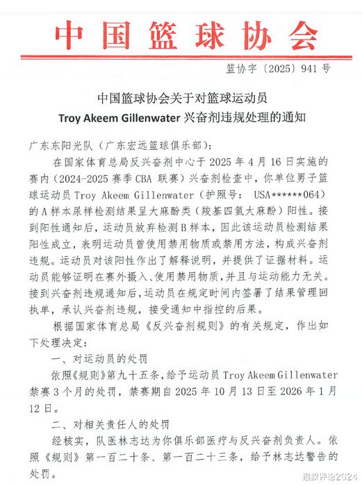 中国篮协:吉伦沃特兴奋剂违规禁赛3个月广东男篮承担3万6检测费