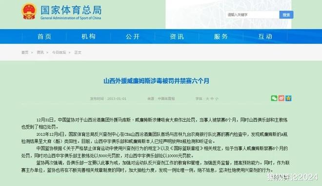 2012年12月9日,国家体育总局反兴奋剂中心在CBA山西汾酒集团队客场与吉林九台农商银行队比赛的赛内检查中,发现威廉姆斯的A瓶检测结果呈大麻(酚)类阳性。山西中宇俱乐部和威廉姆斯本人已经声明放弃B瓶检测和听证会。中国篮协根据《关于严格禁止体育运动中使用兴奋剂行为的规定》以及《国际篮联章程》相关规定,给予当事人威廉姆斯禁赛6个月的处罚,同时对山西中宇俱乐部主教练处以5000元罚款,对山西中宇俱乐部处以10000元罚款。