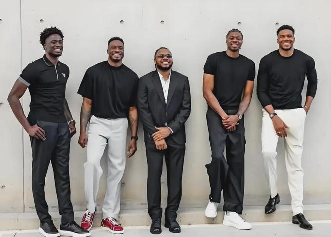 三兄弟聚首字母哥在家中排行老三,二哥萨纳西斯上赛季因为跟腱撕裂根本就没打球,之前在雄鹿的5个赛季,场均也只有2.4分1.6篮板,只在垃圾时间上场。至于五弟亚历克斯,如果不是字母哥,我们大概率都不会知道这个人。亚历克斯在美国读的高中,只是三星高中生,而刚刚被篮网裁掉的中国球员曾凡博,在美国读书时还是四星高中生。字母哥被称为“希腊怪兽”,但他们的父母来自尼日利亚,字母哥五兄弟的老大弗朗西斯-阿德托昆博出生在尼日利亚拉各斯。五兄弟的父亲查尔斯是足球运动员,母亲维罗妮卡练跳高,查尔斯来自尼日利亚第二大民族约鲁巴人,休斯顿火箭队史第一人,传奇中锋奥拉朱旺就是约鲁巴人。80年代末,尼日利亚的经济陷入困境,很多人失业,查尔斯和维罗妮卡都难以找到工作,决定前往希腊寻找机会。1991年,查尔斯和维罗妮卡将年幼的大儿子弗朗西斯留给他的爷爷奶奶抚养,夫妻俩去了希腊雅典。字母哥五兄弟从老二到老五,都是出生在雅典。大哥弗朗西斯等了29年,才去希腊与父母和弟弟们团聚。与四个打篮球的弟弟不同,弗朗西斯子承父业踢足球,还做非洲音乐。