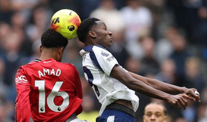 曼联开场就出现失误,拉门斯接回传球竟然把球漏过去,幸好他的站位比较偏,皮球滚出底线,而不是滚进球门。阿莫林被吓了一跳。双方都踢得比较谨慎,创造出的机会很少。但曼联把握住了为数不多的机会,在上半场打进唯一进球。阿马德传中球助攻姆伯莫头球破门。作为10月英超月度最佳球员,姆伯莫延续了此前出色的状态,帮助曼联取得领先。半场结束,曼联1-0热刺。