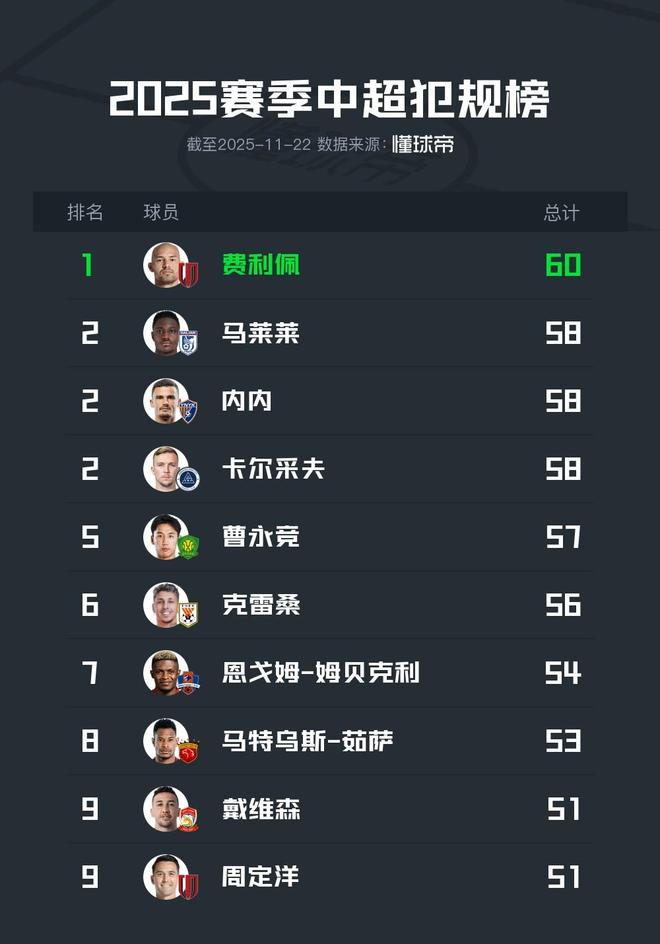 - 中超 | 2025中超犯规榜:费利佩60次第一,马莱莱、内内58次并列第二