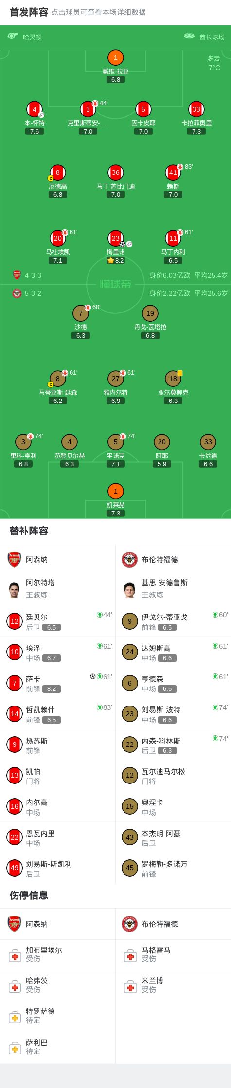 剑南春阿森纳20布伦特福德,梅里诺传射,萨卡建功