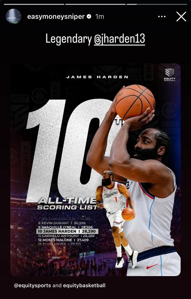 本场比赛,快船球星詹姆斯-哈登惨遭“里程悲”,他通过本场比赛完成对卡梅隆-安东尼的超越,正式升至NBA历史总得分榜的第十位。在哈登完成这一成就后,哈登的前队友、目前效力于火箭队的杜兰特发布个人社媒,晒出哈登的里程碑海报为其庆祝,他配文写道“传奇哈登”。随后哈登也在社媒上回复了杜兰特,并写道:“哎,告诉詹姆斯(总得分榜第一)我们可在前十榜单中了啊。你们俩都与众不同!”