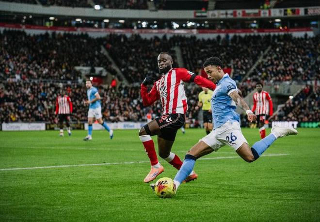 第65分钟曼城再次制造杀机,罗德里右路起脚传中,格瓦迪奥尔前插甩开防守球员后,在禁区内头球攻门,但被桑德兰门将神扑化解,余下的近半个小时的时间,曼城继续围攻桑德兰,但后者的密集防守让蓝月军团束手无策,始终无法将攻势转化为进球,只能接受一场闷平的结局。